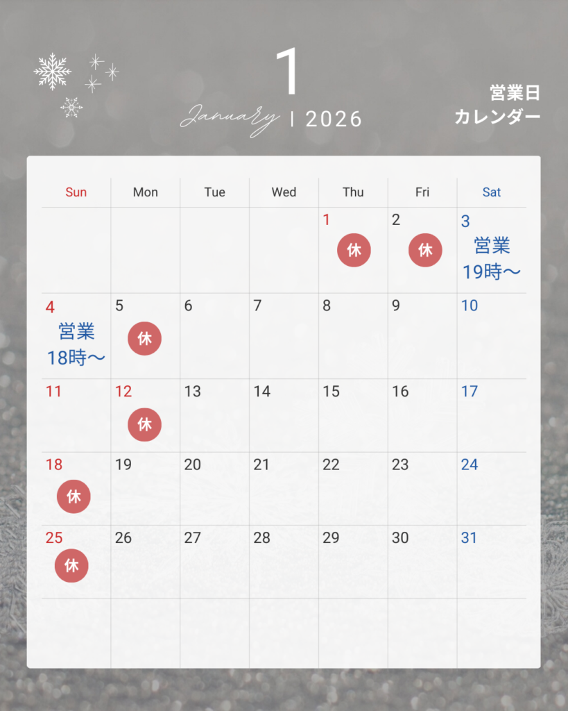 新年は3日から営業致します。5日月曜日はお休みを頂戴し